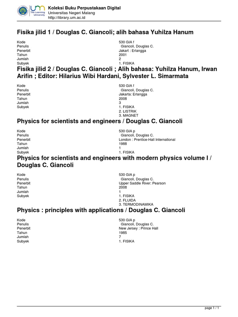 / Buku Fisika Dasar 2 Giancoli Pdf - Jual Perguruan Tinggi Fisika Prinsip Aplikasi Jl 2 Ed 7 Dari Penerbit Buku Erlangga Original Murah Bukuerlangga Co Id - Maybe you would like to learn more about one of these?