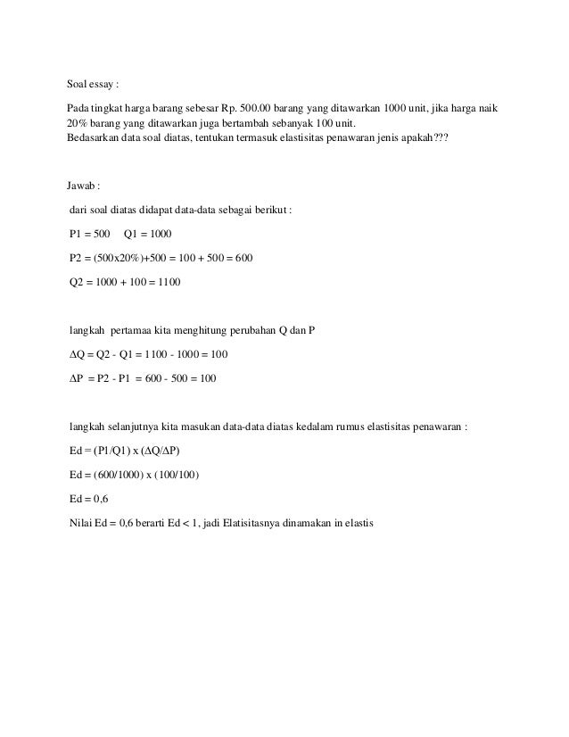 All our writers are degreed experts in many fields of study, thus it will be easy to soal essay tentang elastisitas permintaan dan penawaran handpick a professional who will provide the best homework assistance possible. Soal dan jawaban tentang elastisitas penawaran. Jawablah soal berikut dengan mengamati lebih dahulu grafik dibawah ini! Artinya, semakin tinggi harga barang, maka semakin banyak penawaran pada suatu barang. Berikut ini akan ditampilkan beberapa soal uraian atau essay dan pembahasan.