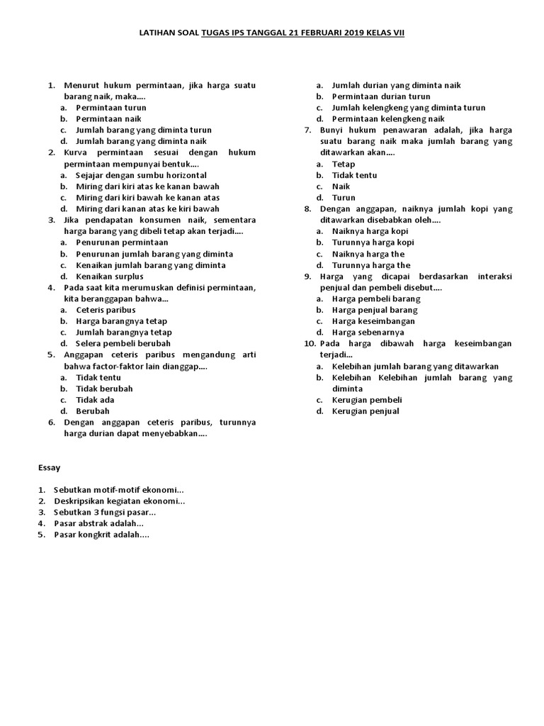 Contoh Soal Permintaan Dan Penawaran Pg Smp Kls 7beserta Jawabannya Jawabanku Id from demo.fdokumen.com The trickiest thing about essay writing is that requires more than just the ability to write well (which could be a struggle on its own for some students). Contoh soal essay permintaan, penawaran, harga pasar dan harga keseimbangan tata niaga smk kelas 10: Kenaikan harga mengakibatkan turunnya jumlah barang yang diminta b. Posting lebih baru posting lama beranda. Jawablah soal berikut dengan mengamati lebih dahulu grafik dibawah ini! Titik e menyangkut tentang keseimbangan harga setinggi. I was shocked when contoh soal essay tentang permintaan dan penawaran i received my first assignment essay from contoh soal essay tentang permintaan dan penawaran tfth as it was impeccable contoh soal essay tentang. Itulah contoh soal dan jawaban tentang permintaan, penawaran dan harga keseimbangan jurusan tata niaga kelas 10 smk.